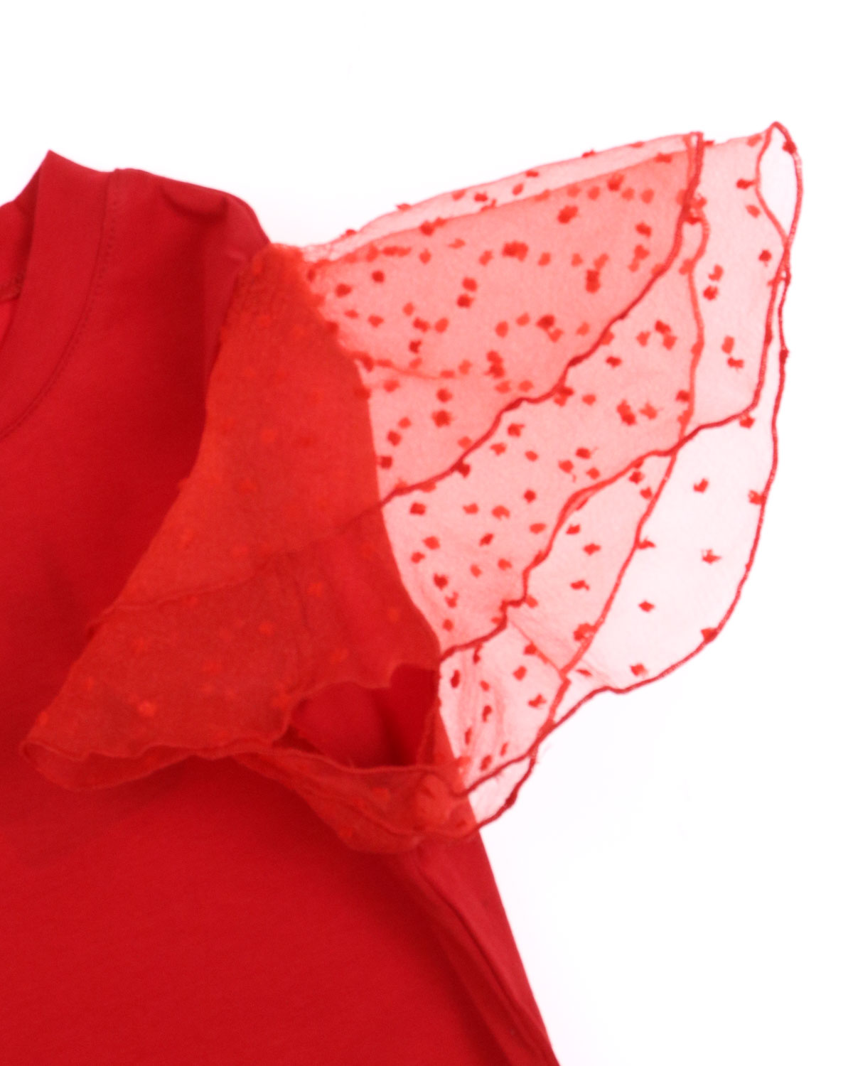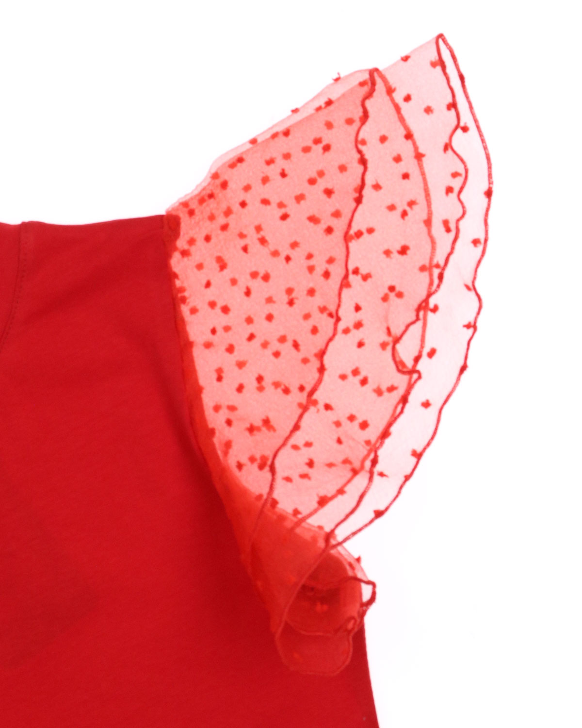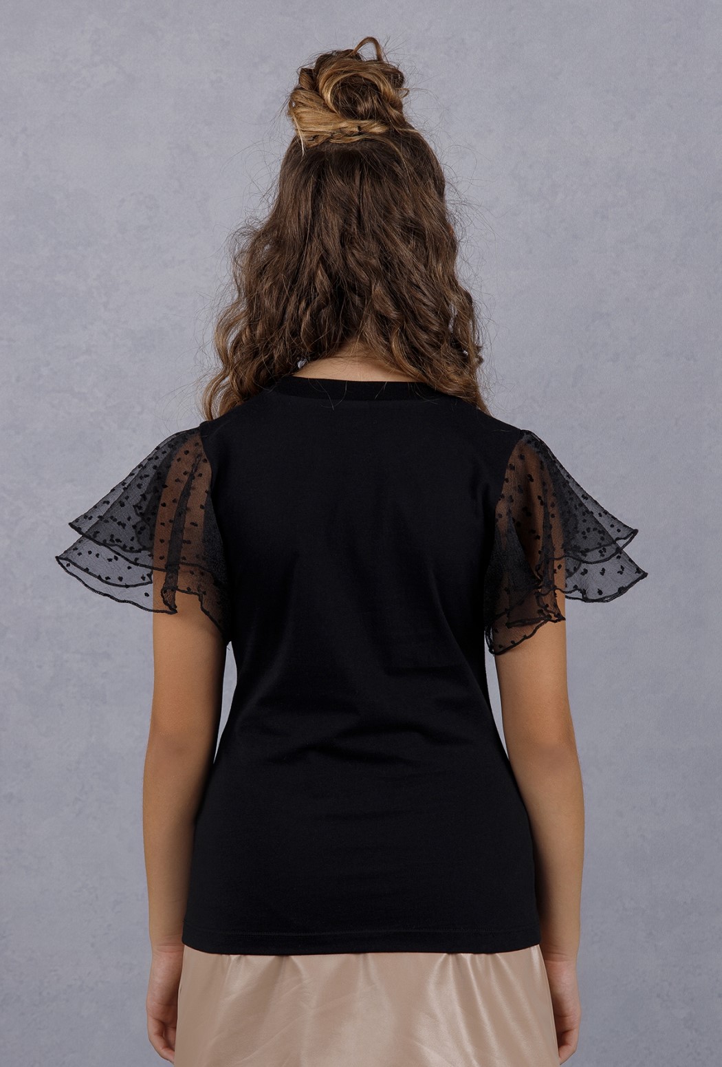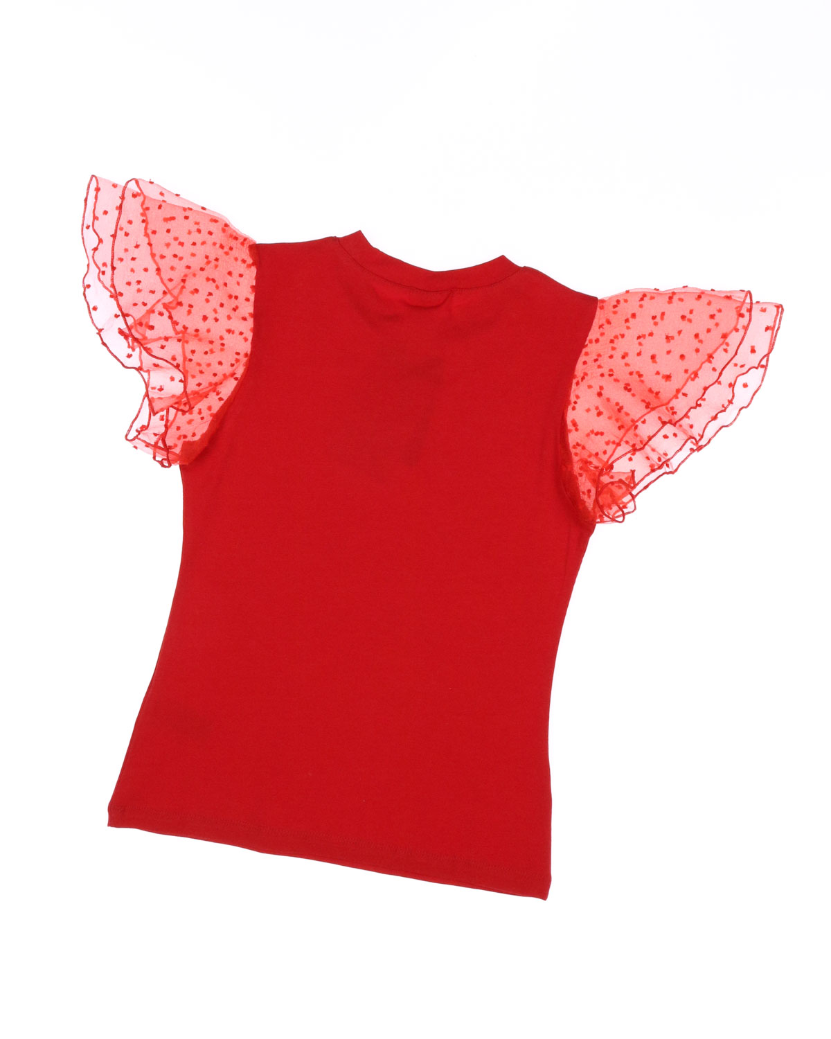 Нарядная футболка Dmb оптом выполнена из мягкого трикотажа приталенного кроя с короткими рукавами воланами из органзы.