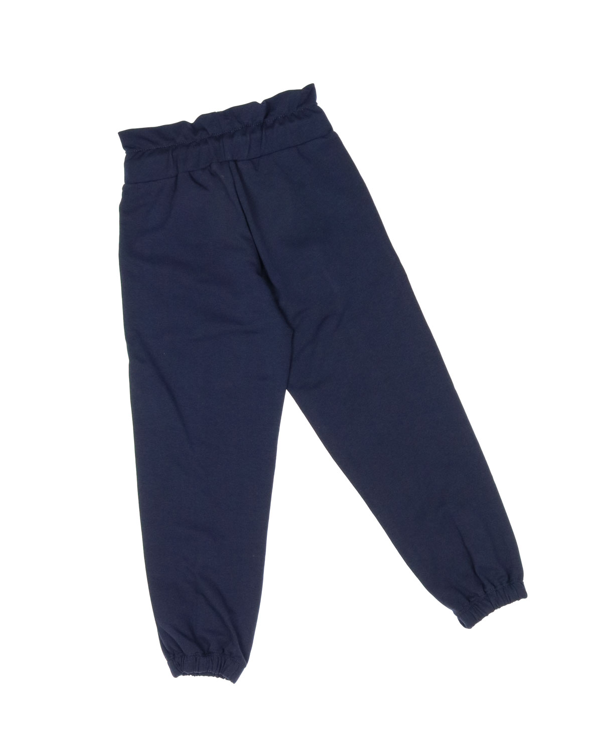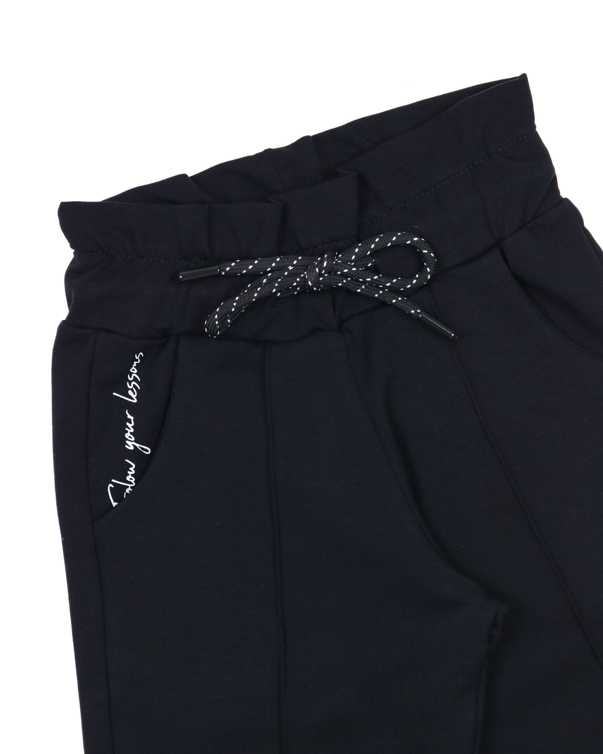 Спортивные трикотажные брюки для девочки на эластичном поясе. Брюки оформлены отстрочными стрелками и эластичными манжетами.