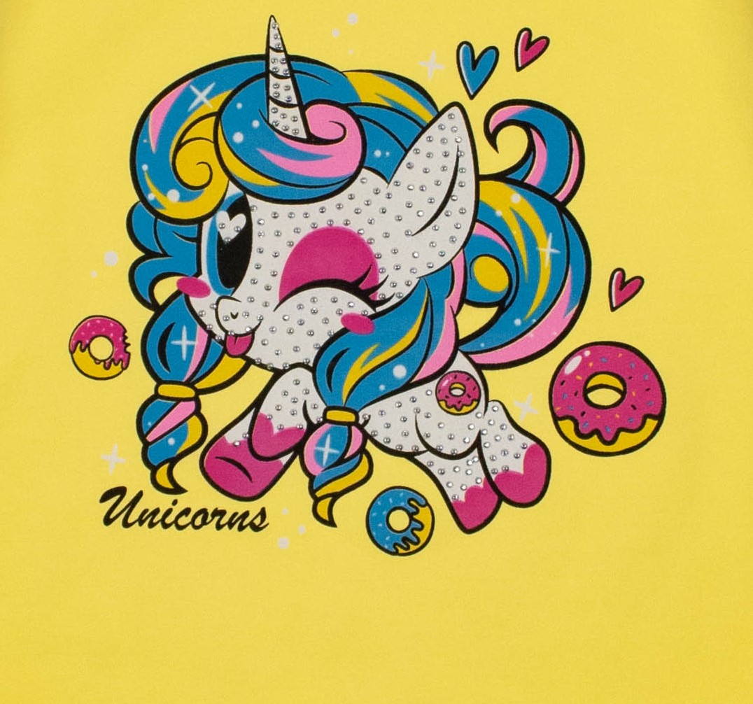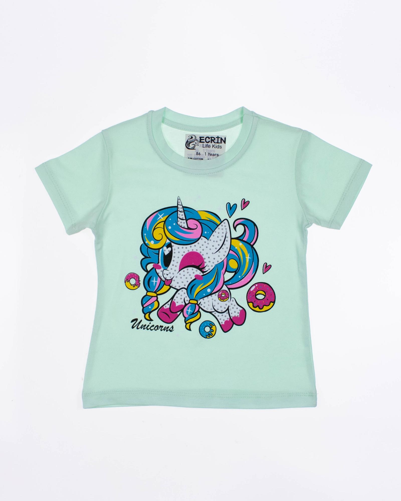 Футболка ECRIN для девочки оптом, производства Турция. Модель приталенного силуэта с короткими рукавами, милый принт украшен стразами.
