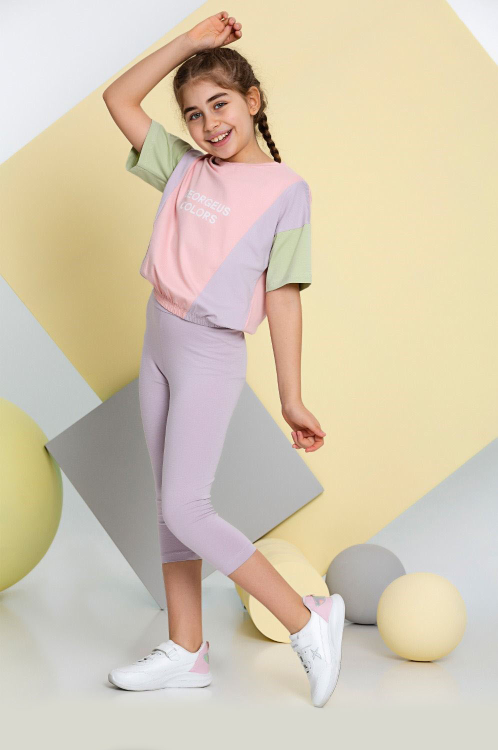Костюм отлично сидит на фигурах разных типов. Укороченная футболка со спущенным рукавом на резинке и бриджи делают летний комплект оригинальным и стильным. Костюм выполнен из мягкого трикотажа кулирка.