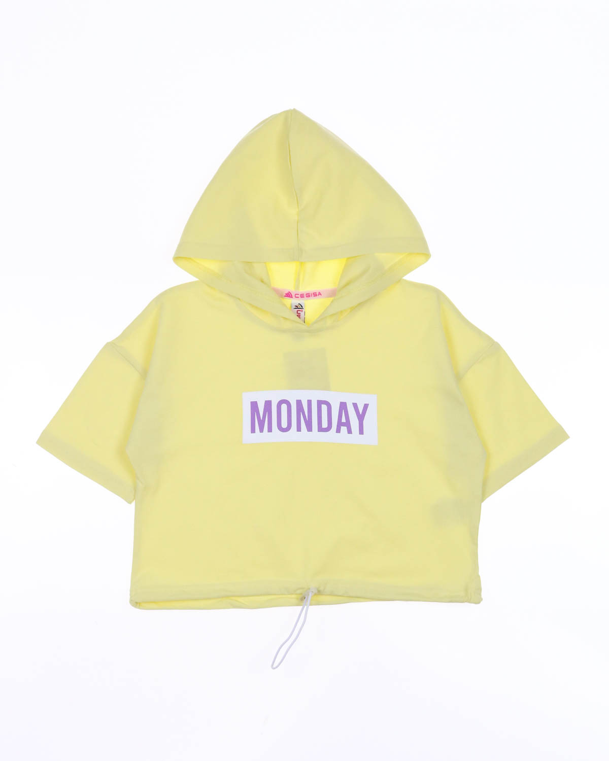 Летний костюм для девочек с принтом MONDAY. Кофта со спущенными короткими рукавами, дополненая капюшоном, низ на шнурке и трендовые велосипедки. Изготовлен из хлопка с добавлением лайкры.