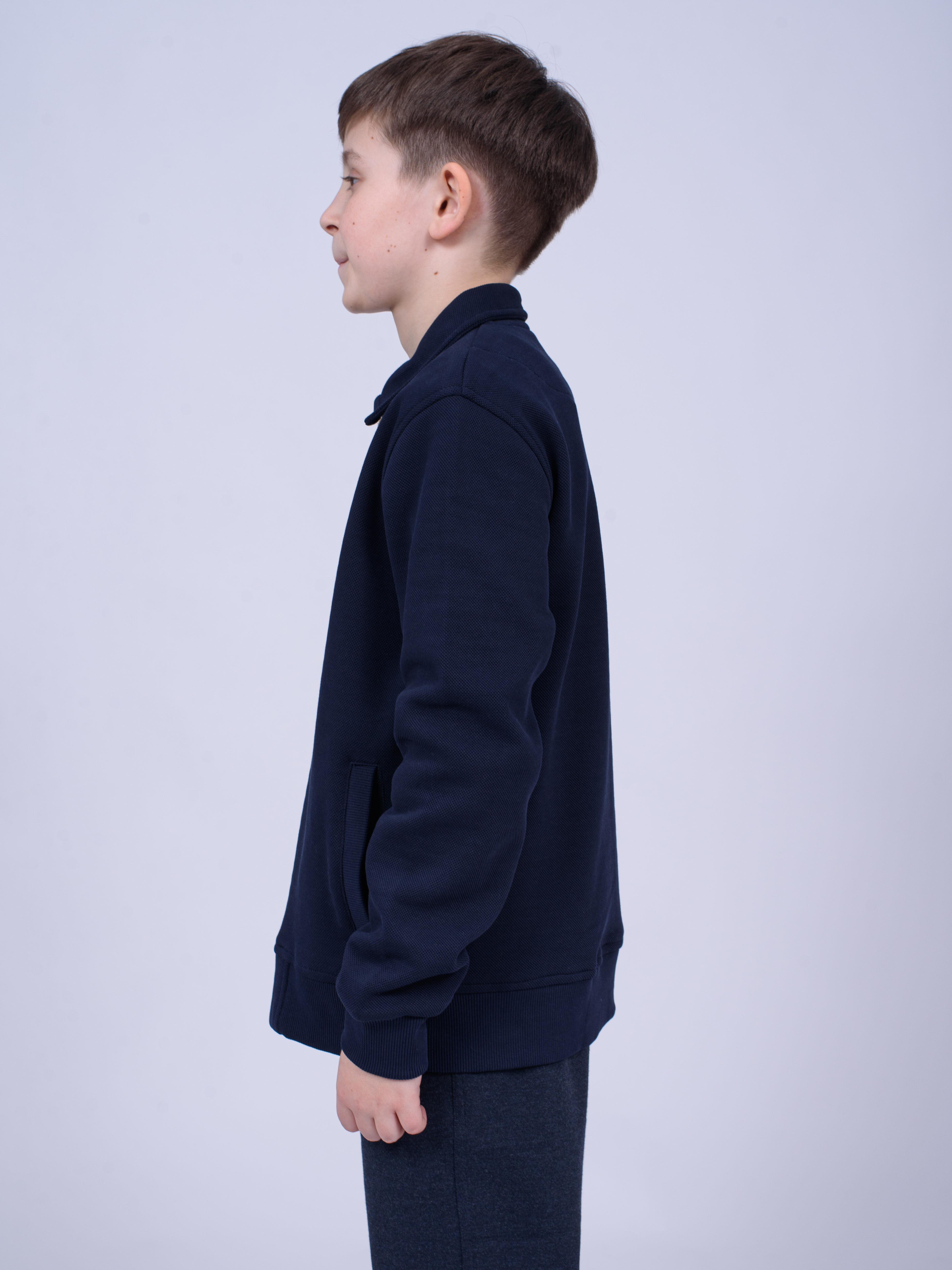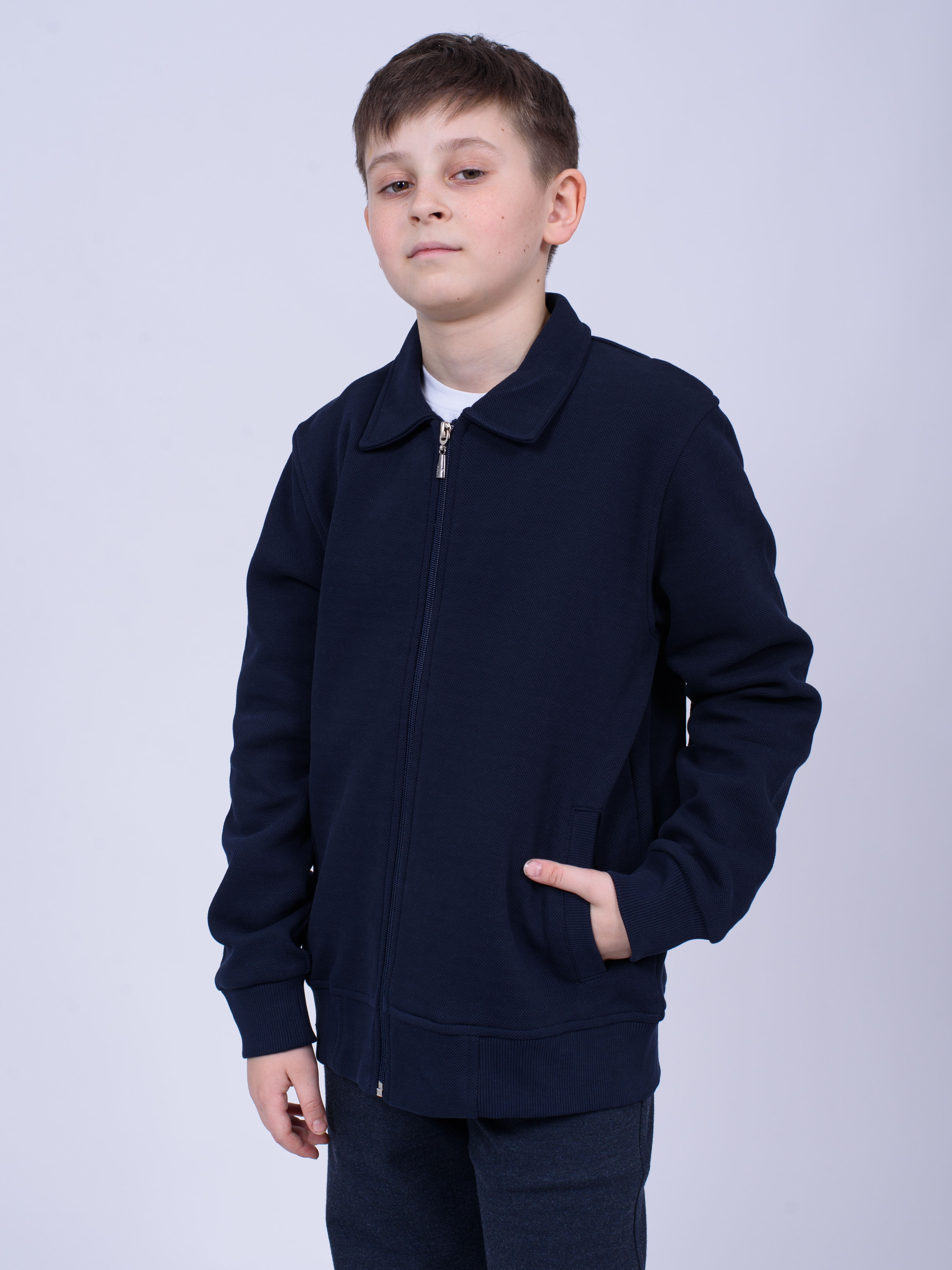 Трикотажный бомбер Cegisa для мальчика оптом. Выполнен из смесовой ткани, в составе которой натуральный хлопок с добавлением полиэстера, трикотаж плотный. Воротник отложной. Низ изделия и рукава на трикотажном манжете. Вместительные карманы и разъемная застежка - молния. Хорошо сохраняет цвет и форму при длительной носке и после многократных стирок. Прекрасно будет смотреться как школьная форма.