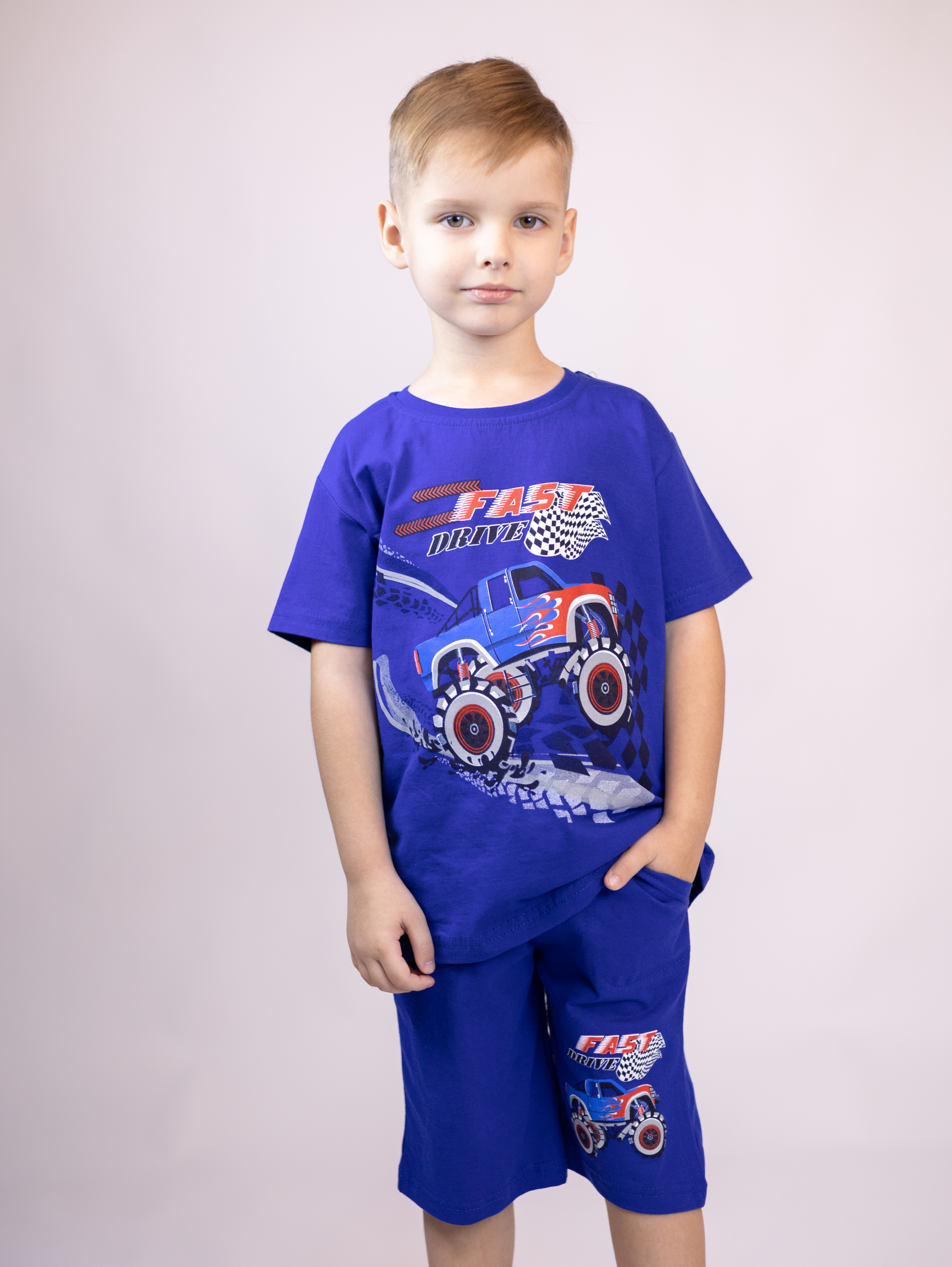 Трикожный костюм BOLD оптом из 100% хлопка с оригинальным, ярким принтом. Шорты трикотажные с карманами.