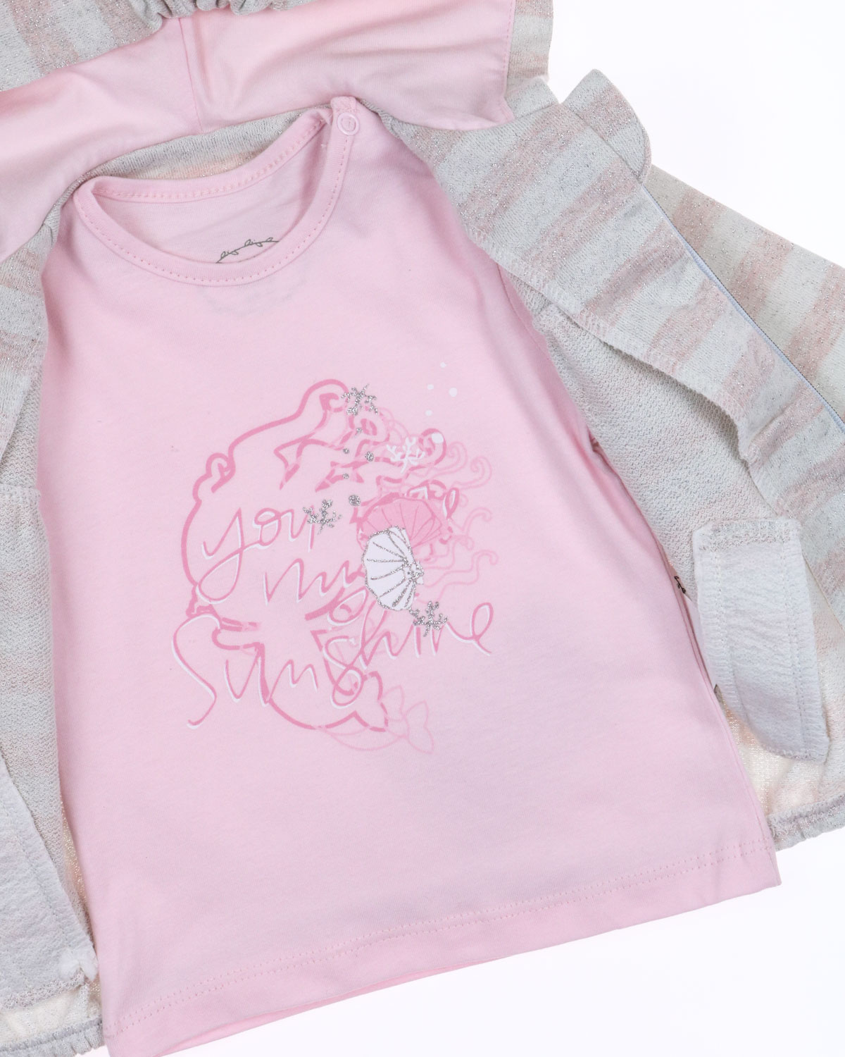 Детский стильный комплект состоит из толстовки, футболки и джогерров. Ткань мягкая, дышащая, 100% хлопок с люрексом. Можно носить дома, на прогулку, в гости.
