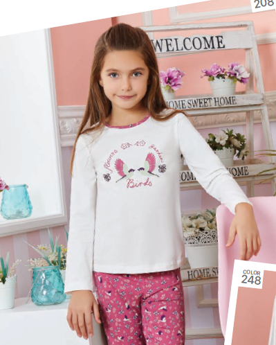 Пижама BAYKAR для девочки оптом с длинными рукавами и прямыми брюками без манжетов. Поверхность пижамки не закатается и не покроется пилями,  благодаря высокому качеству хлопка. Небольшое добавление эластана не позволит изделию сесть и не даст вытянуться.